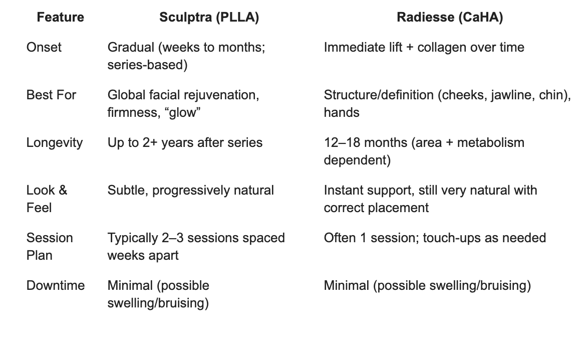 Radiesse (CaHA): Think of it like scaffolding plus renovation. You see instant structural support (cheeks, jawline, chin), while your collagen remodels over the following months.